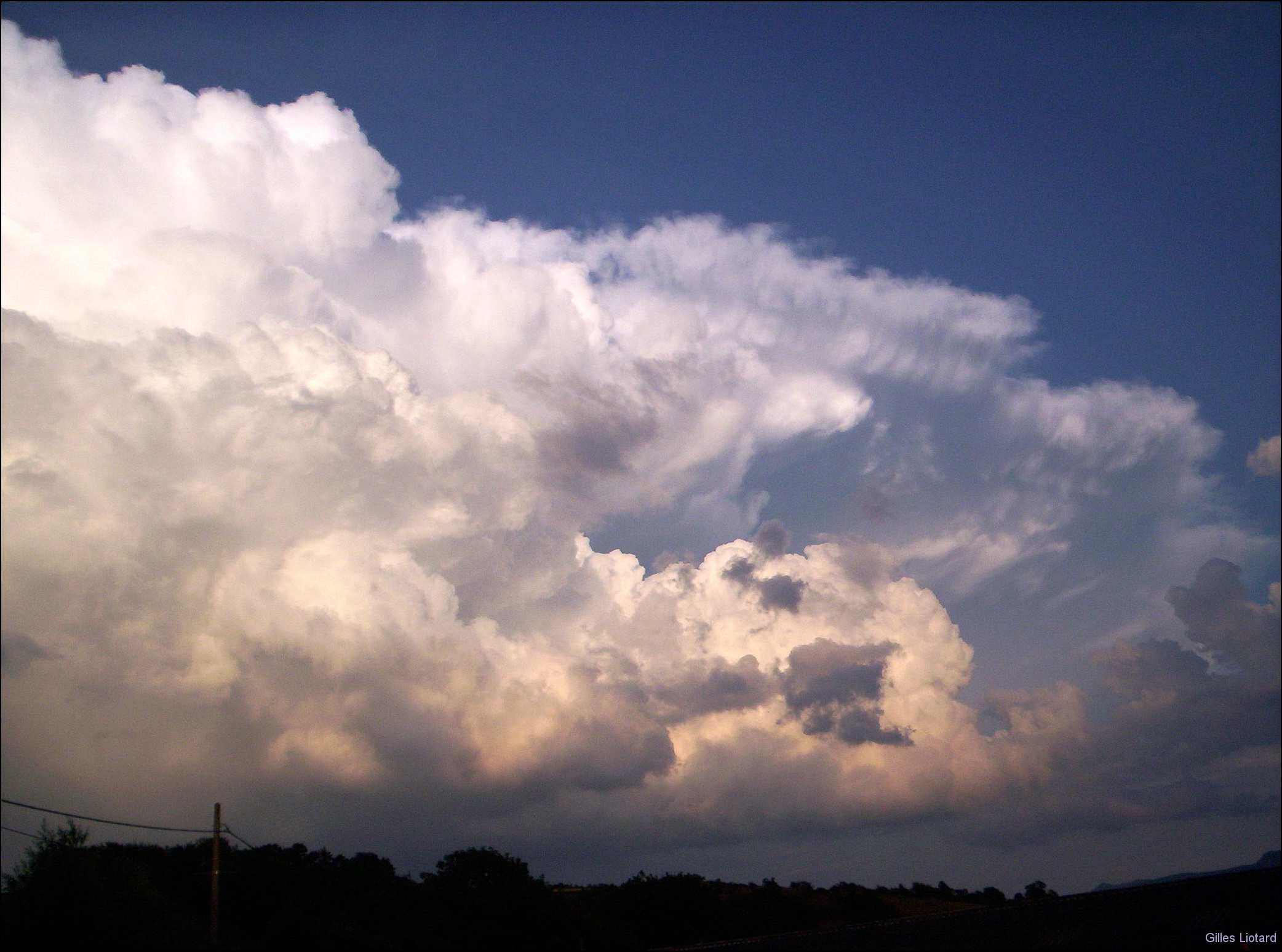 Vers 20h00, le tonerre gronde, et la pluie se met à tomber alors qu'on est à la limite du nuage! Puis la grêle, et un vent d'Est sporadique se met à souffler en grandes raffales. Au sol, les grêlons ne tiennent pas en place, ils roulent... drôle d'impression: nous sommes à la limite de l'orage qui sévit à l'Est, la grêle tombe et le vent souffle en rafales tandis que le soleil brille! Je vous assure c'est une drôle d'impression! La grêle tombe quelques minutes puis l'orage s'éloigne, je décide de sortir de mon abris et prends cette photo, en s'éloignant de moi, le nuage parait de plus en plus gros, le cumulo nimbus est énorme! D'ailleurs je me demande s'il n'y a pas 2 orages?