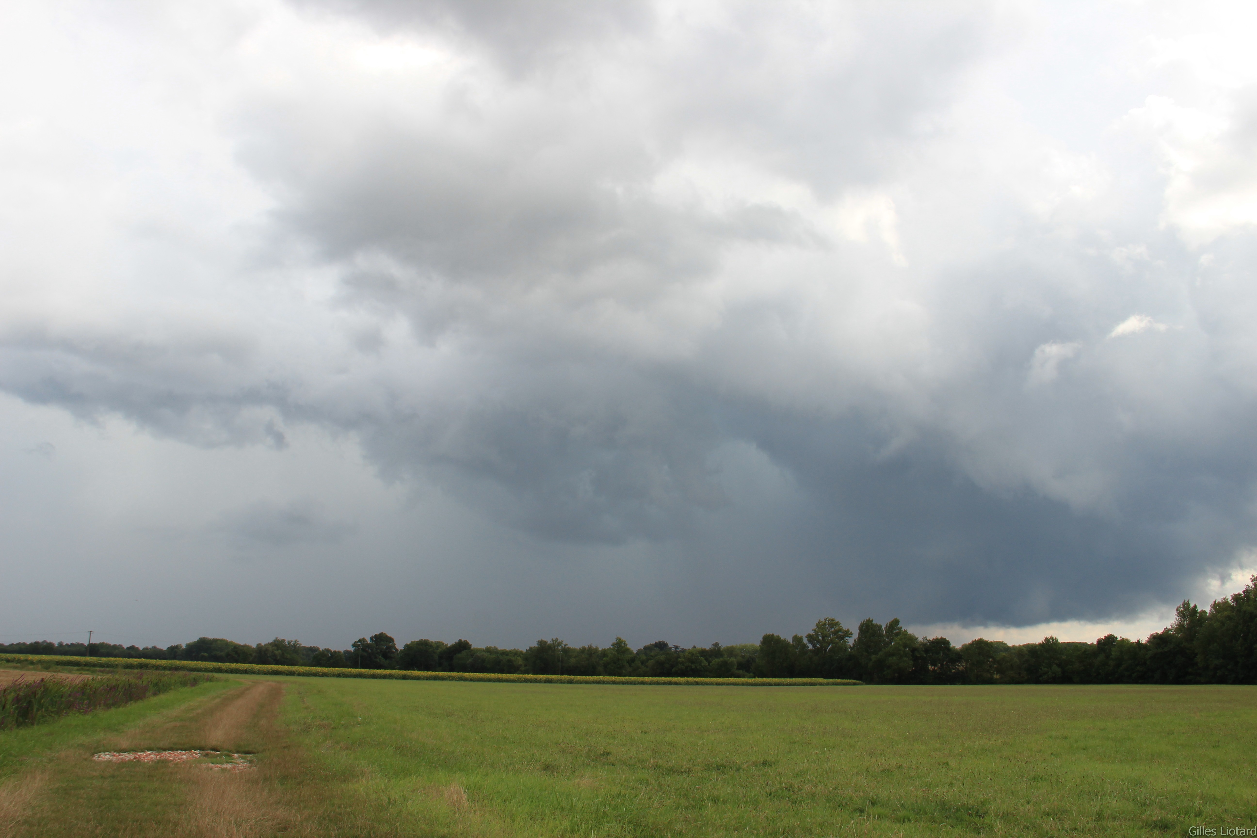 J'ai roulé de Toulouse vers Auch tout en scrutant le ciel nuageux mais bien découpé, et en sachant que j'avais déjà un peu de retard sur la cellule, mais heureusement - et contrairement aux situations orageuses pré-frontales - le flux était lent et les cellules plus faciles à rattraper... sans compter la pluie ... Arrivé à Mauvezin dans le Gers j'avais rattrapé la cellule déjà bien ronde et grosse au radar, le pied. Je m'arrête dans un champ pour faire un time-lapse de la base, au Sud de la cellule, elle n'est pas photogénique contrairement à ce que laissait penser le radar, alors je m'approche encore.