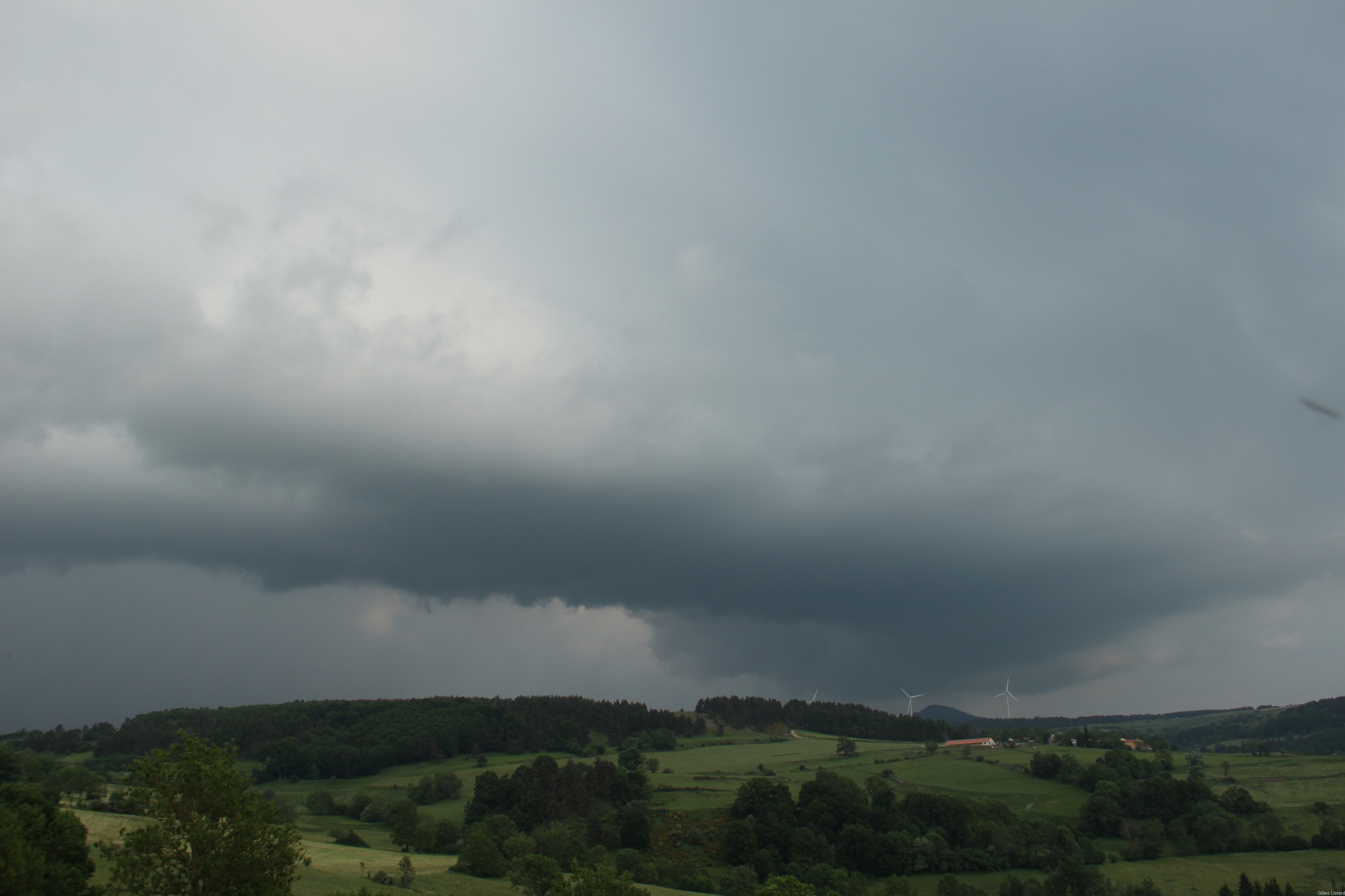 Mercredi 10 juin, le vent de Sud a repris, mais ce n'est pas sans compter les 2 cellules qui remontent d'Ardèche comme des colosses, dont une qui a donné de la pluie et de bons coups de tonnerre sur le Mézenc vers 18H00, une autre a été photographiée lors de sa phase de regénération au dessus de la vallée du Velay. Ensuite une petite pluie est tombée.