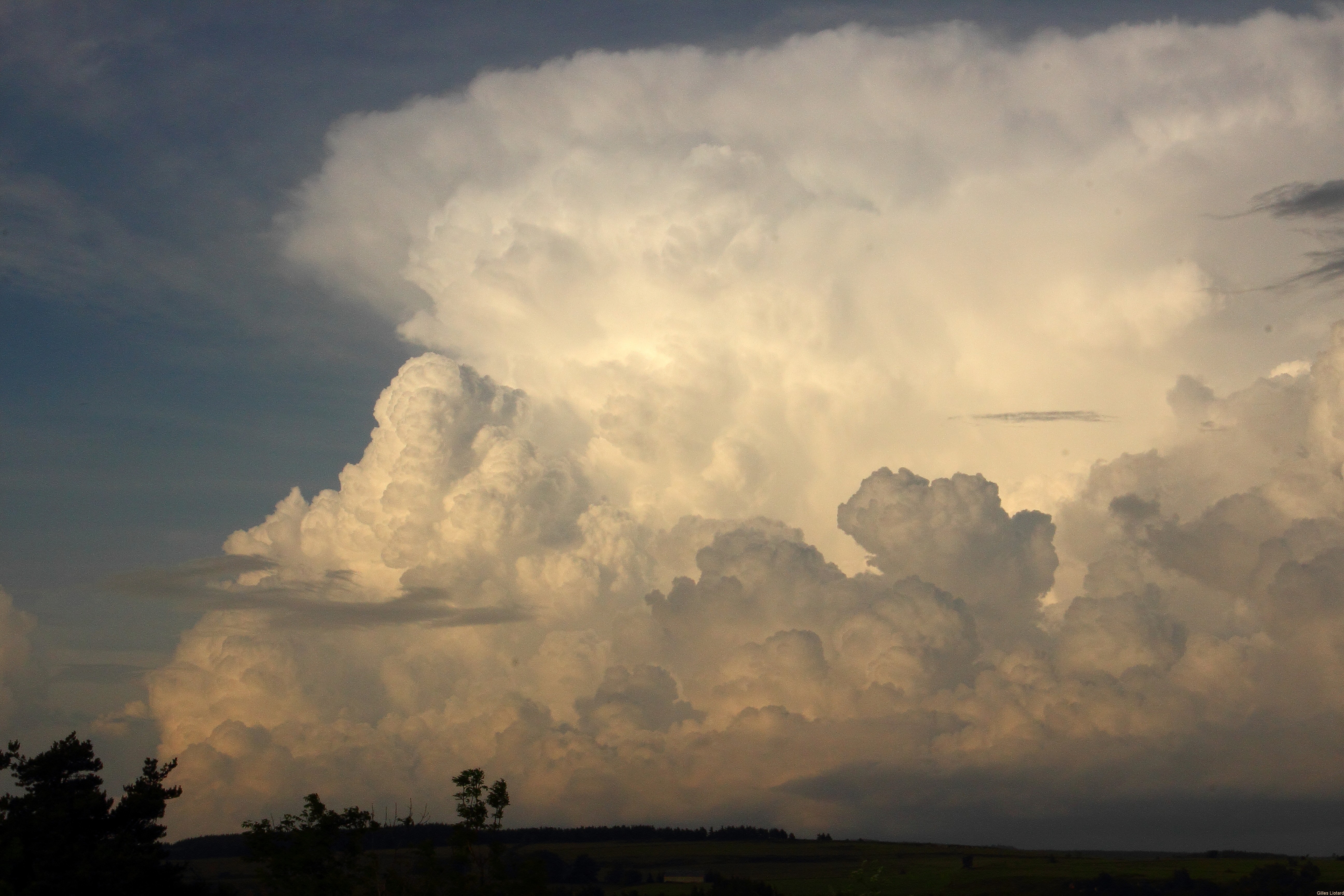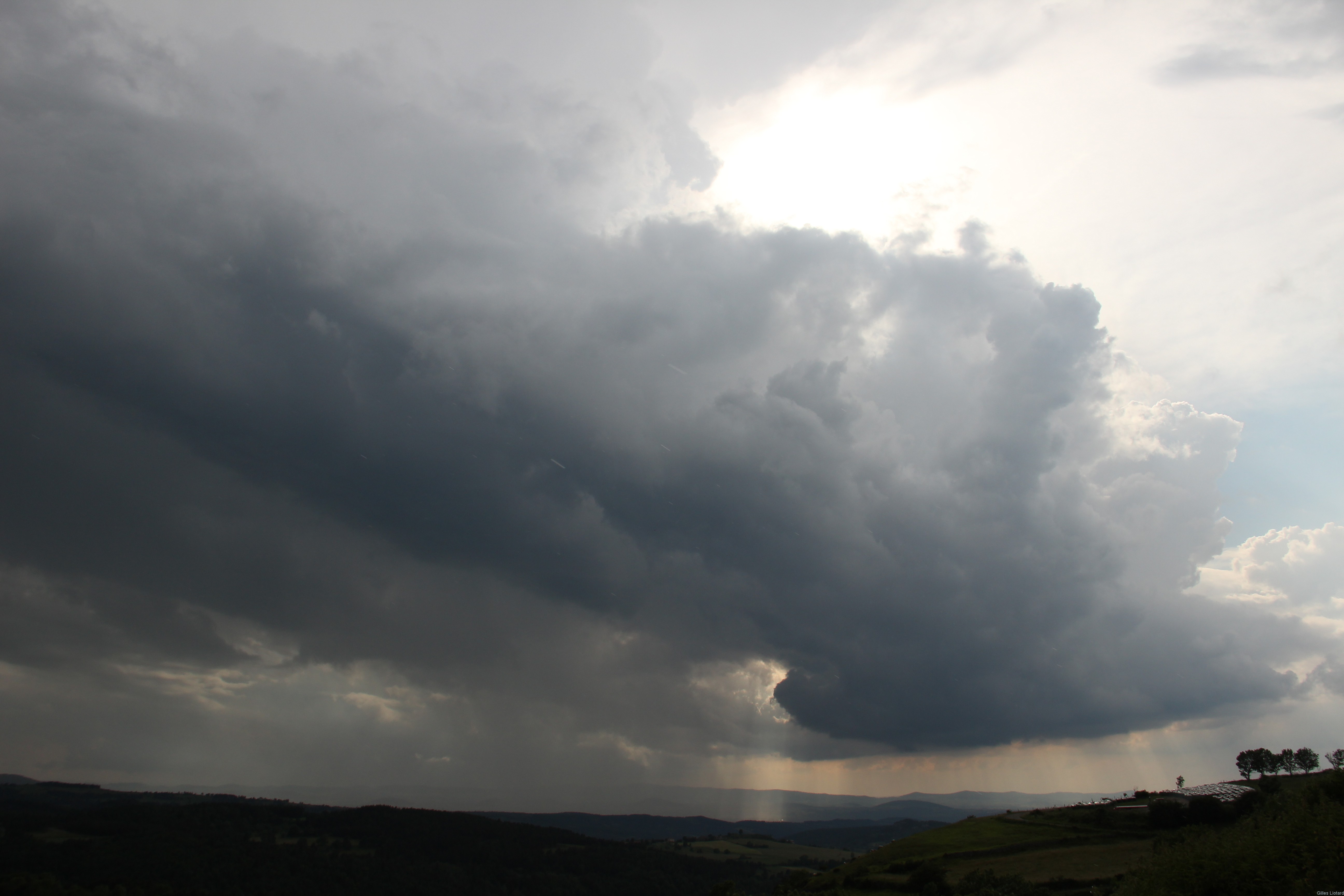 Tout commence le samedi 6 Juin, alors que le soleil cogne avec un léger vent de sud, température autour de 25°C vers 1000m. La météo est annoncée orageuse pour plusieurs jours. Ici le vent de Sud a tendance à repousser les orages vers le Nord et nous avons l'habitude de penser que ce vent nous permet de rester au sec, mais cette fois c'est faux ! Après le soleil de la journée et une masse orageuse noire vers l'Ouest durant tout l'après-midi, vers 18H00 tout s'accélère pour le plateau du Mézenc. Voici une idée de l'altitude des nuages à 19:15 :